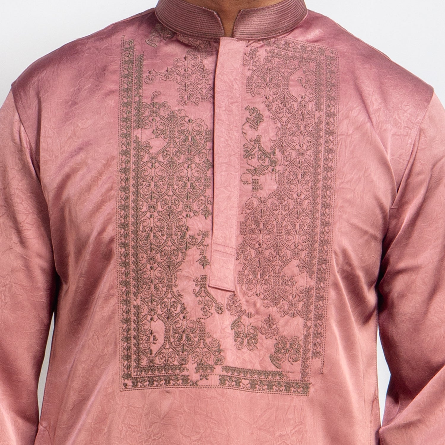 Man wearing a DUSTY ROSE kurta with white pants on a light gray background