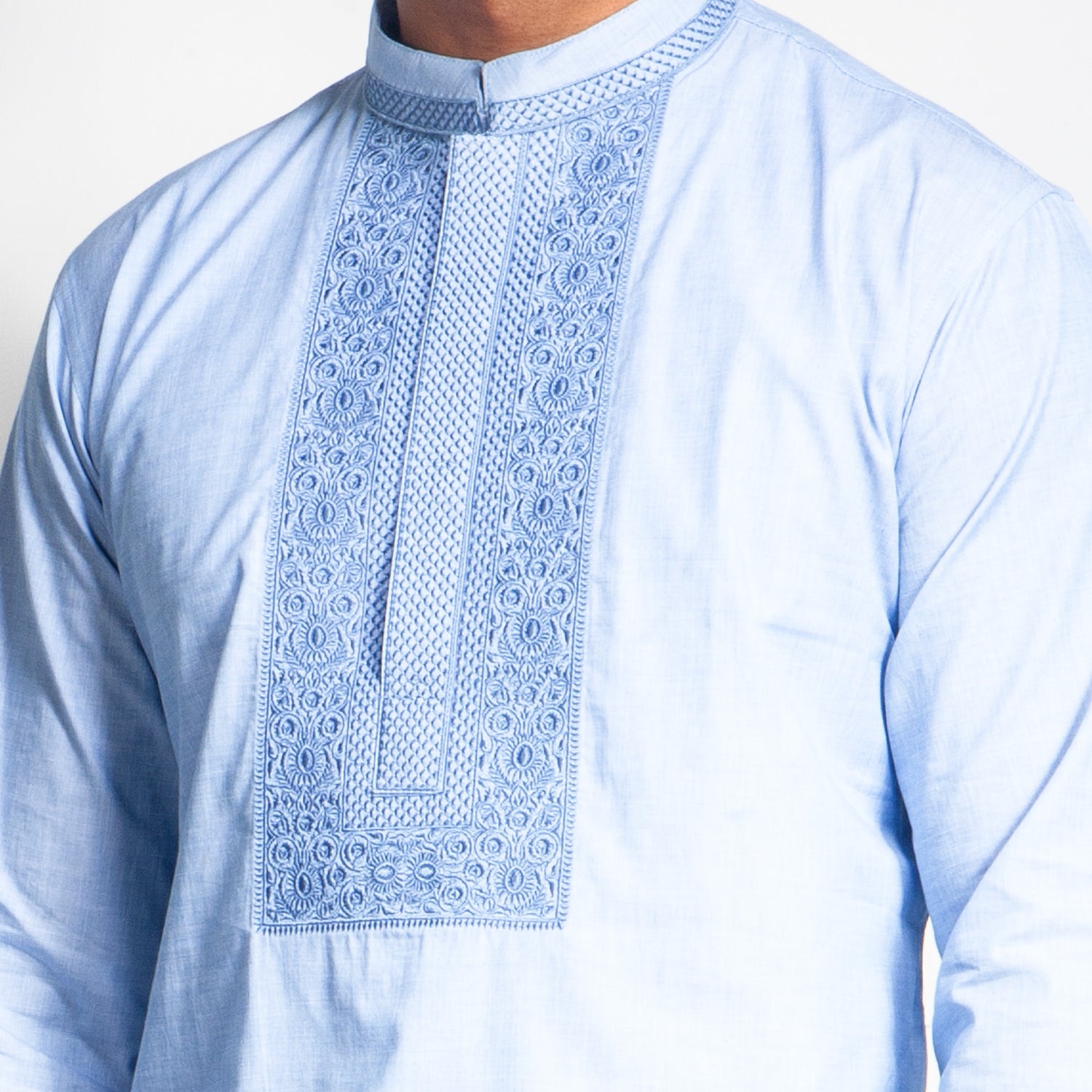 Man wearing a light blue panjabi with white pants on a plain background