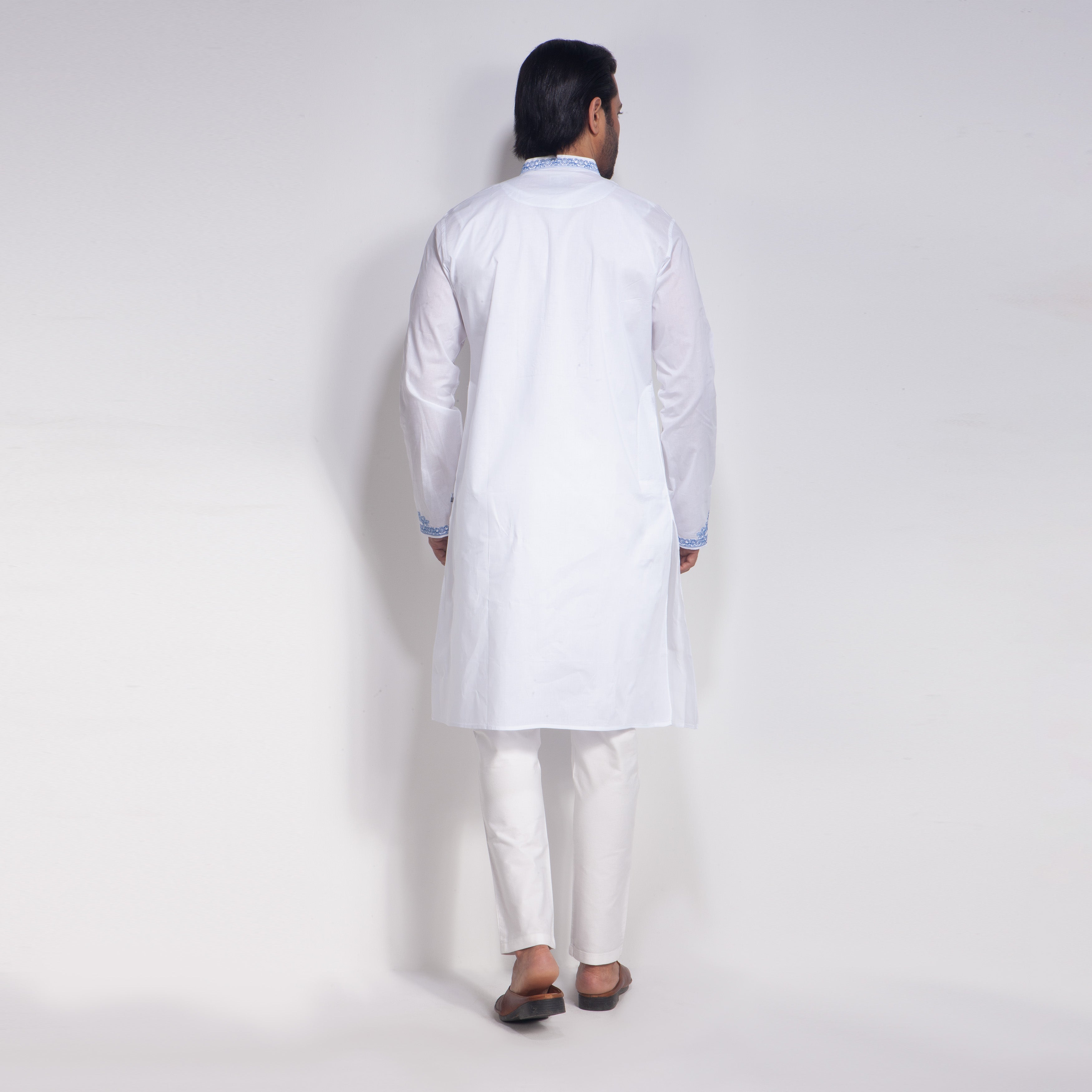 Man wearing a white panjabi with blue embroidery on a white background